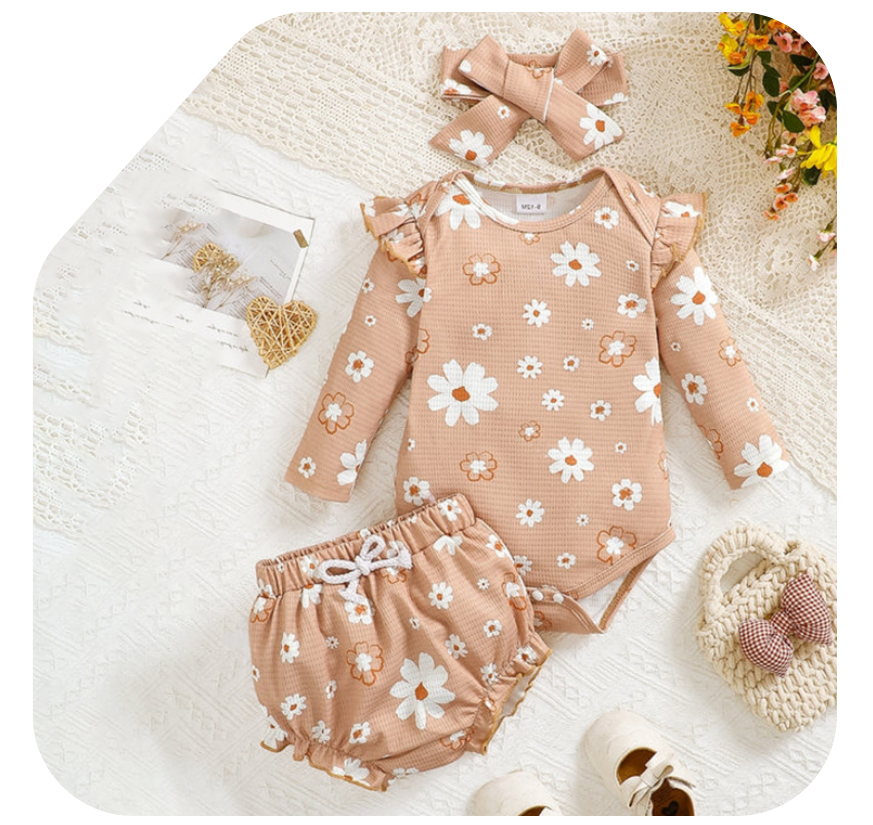Dress your little one in pure cuteness with our Ruffled Floral Bodysuit, Bloomer, and Headband Set. Made from soft, breathable fabric for all-day comfort, this timeless outfit offers both style and playability. The delicate ruffles and floral design bring elegance, while the matching bloomer ensures freedom for your baby’s every move!